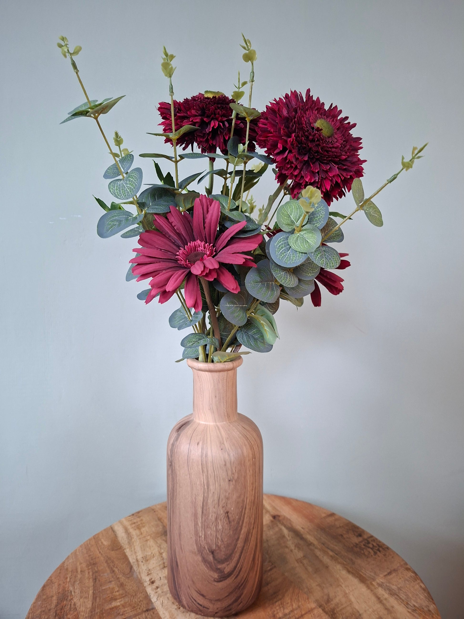 Keramieken vaas natural met houtlook – warm boeket van donkerrode gerbera’s, wilde gerbera’s en eucalyptus